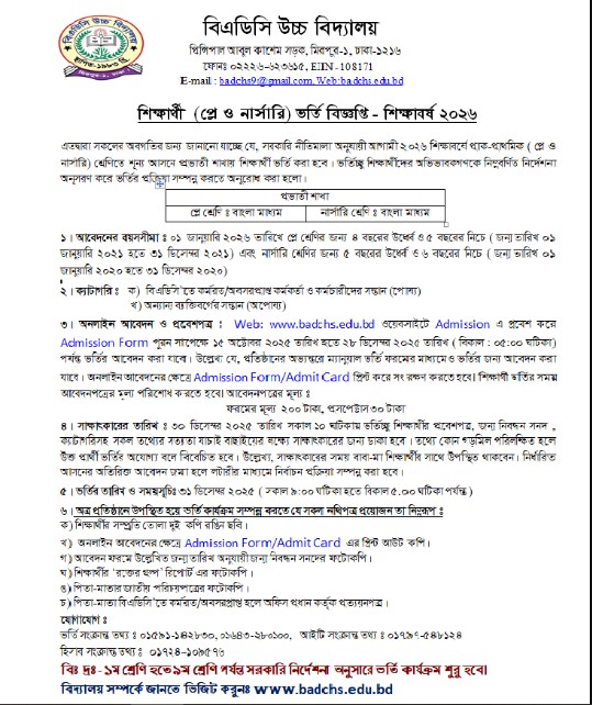 ২০২৬ শিক্ষাবর্ষে প্রাক-প্রাথমিক (প্লে ও নার্সারি) শ্রেণিতে শিক্ষার্থী ভর্তি বিজ্ঞপ্তি